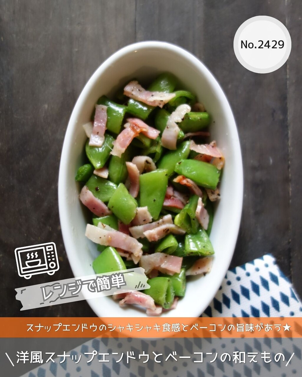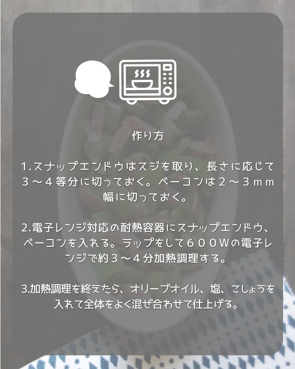 2.電子レンジ対応の耐熱容器にスナップエンドウ、ベーコンを入れる。ラップをして600Wの電子レンジで約3~4分加熱調理する。