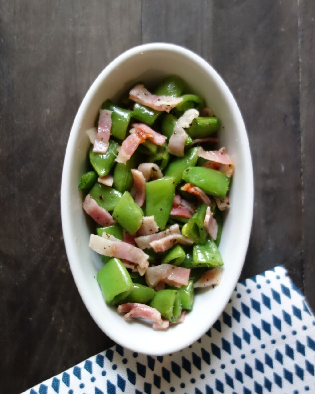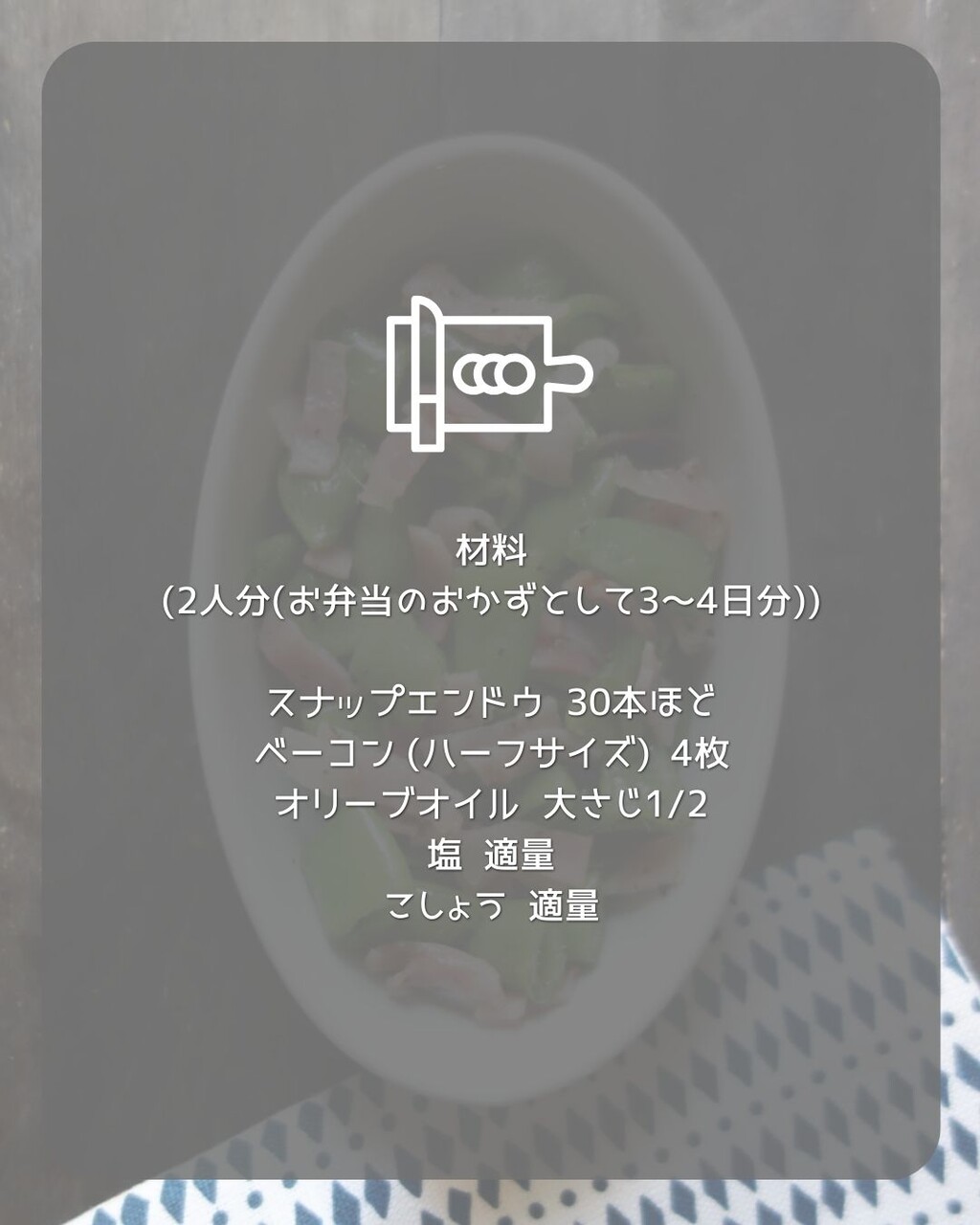 1.スナップエンドウはスジを取り、長さに応じて3~4等分に切っておく。ベーコンは2~3mm幅に切っておく。